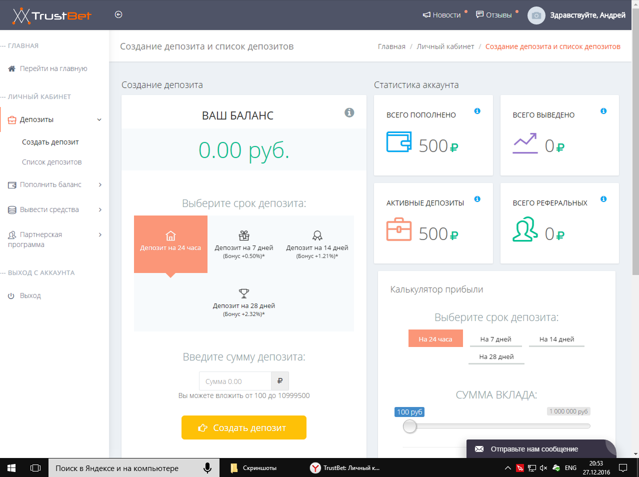 В этой короткой статье, я хотел бы рассказать вам о том, для чего я зарегистрировался на сайте trust-bet! Эти ребята обещают хорошие проценты, вы инвестируете свои средства, они в свою очередь приумножают их используя ставки на спорт. Вы ничего не теряете в случае, если ставка не сыграла, баланс останется прежним . В день гарантируют 1.6% от вклада, а в месяц до 59% , довольно неплохо, ни один банк не даст Вам такую прибыль за короткий срок.